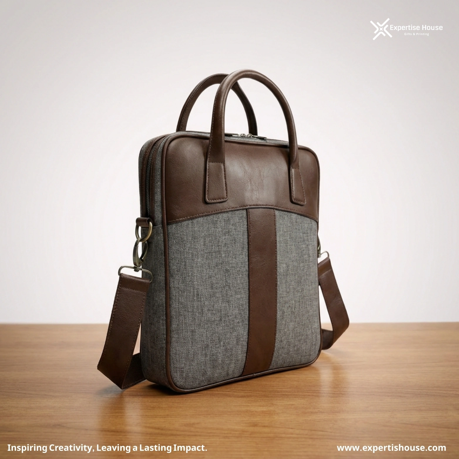 ارتقي بمظهر فريقك المهني مع حقيبة تون التي تدمج بين القماش الرمادي الفاخر والجلد البني الأنيق في تصميم واحد يجمع بين الكلاسيكية والحداثة، حيث تتميز الحقيبة بهيكل نحيف ومنظم يناسب اجتماعات العمل الهامة والتنقلات اليومية، مع مقابض علوية متينة وحزام كتف قابل للفصل لتوفير أقصى درجات الراحة.