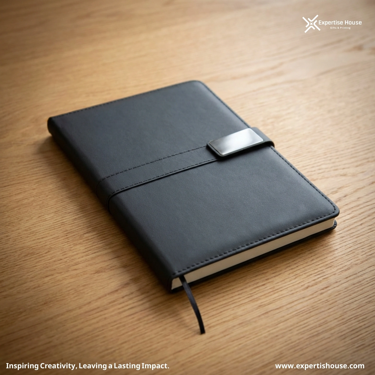دفتر ملاحظات احترافي فاخر مثالي للهدايا الدعائية للشركات والبراندات، يتميز بغلاف من جلد PU أسود بلمسة مطفية أنيقة مع حزام مغناطيسي ولوحة معدنية مخصصة لطباعة الشعار أو النقش، وهذا ما يجعله خيارًا مثاليًا في منتجات دعائية مميزة.