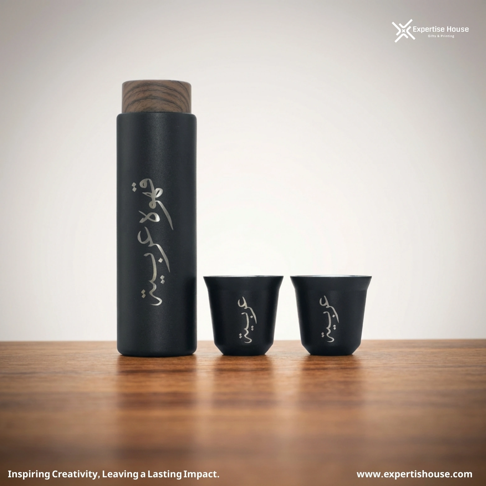 زخارف الخط العربي على الترمس والكوبين تضيف لمسة ثقافية راقية وفخمة.