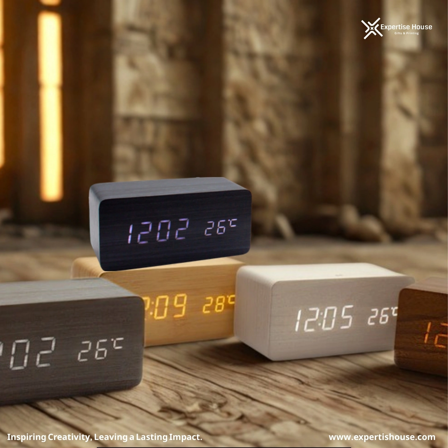 تتميز الساعات بتصميم مستطيل خشبي أنيق مع شاشة LED مدمجة تعرض الوقت ودرجة الحرارة، مما يجمع بين البساطة العملية والمظهر العصري الراقي.