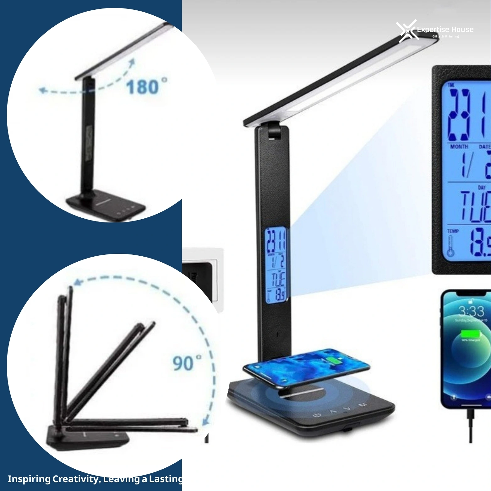 مصباح المكتب LED القابل للطي مع قاعدة شحن لاسلكي وساعة رقمية هو إكسسوار مكتبي ذكي ومتعدد الوظائف مثالي للمكاتب، مكاتب الدراسة، جانب السرير، الهدايا التنفيذية، والحملات الترويجية للشركات.