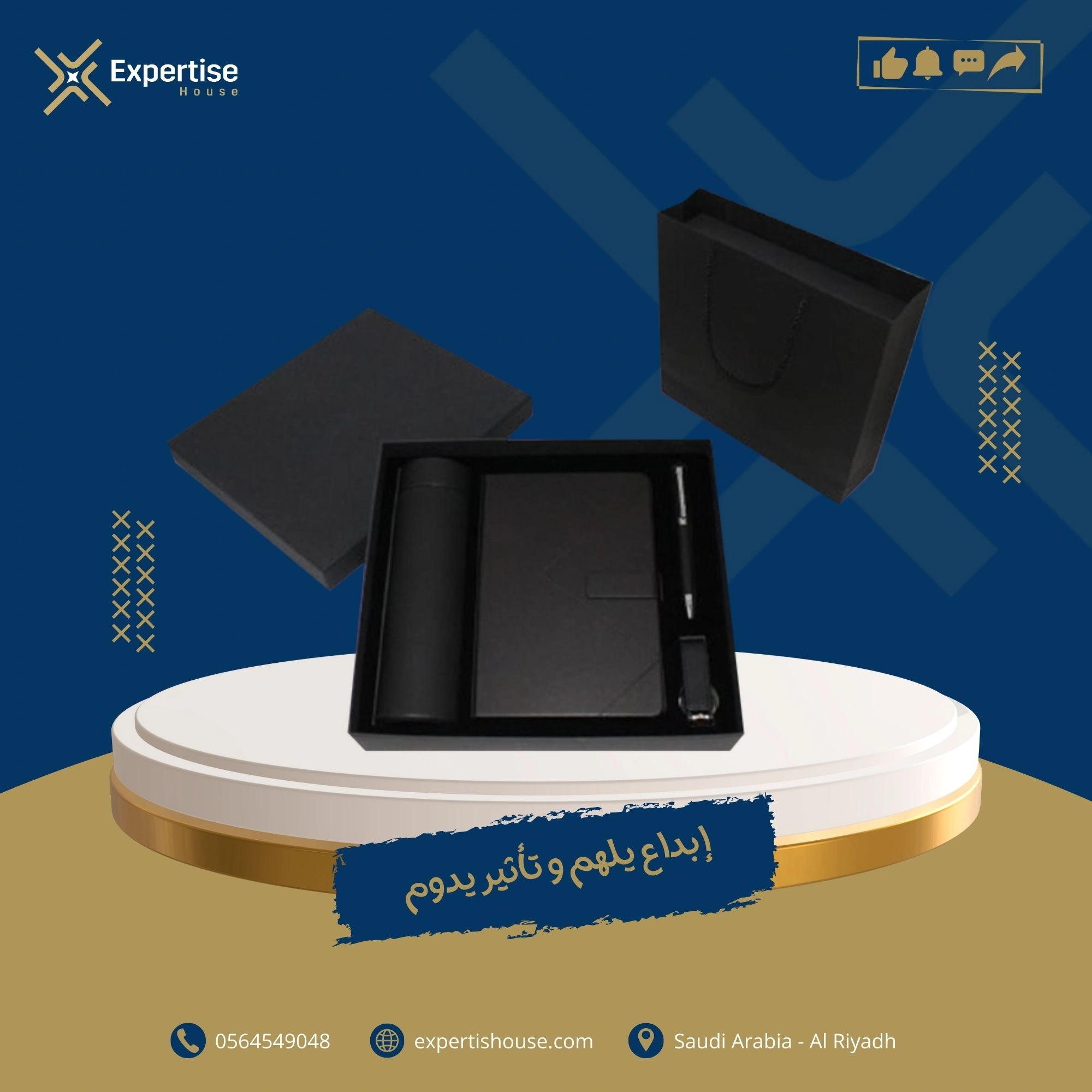 طقم هدايا مكتبي فاخر يضم مفكرة جلدية أنيقة، زجاجة حرارية، قلم وUSB داخل علبة تقديم فاخرة.