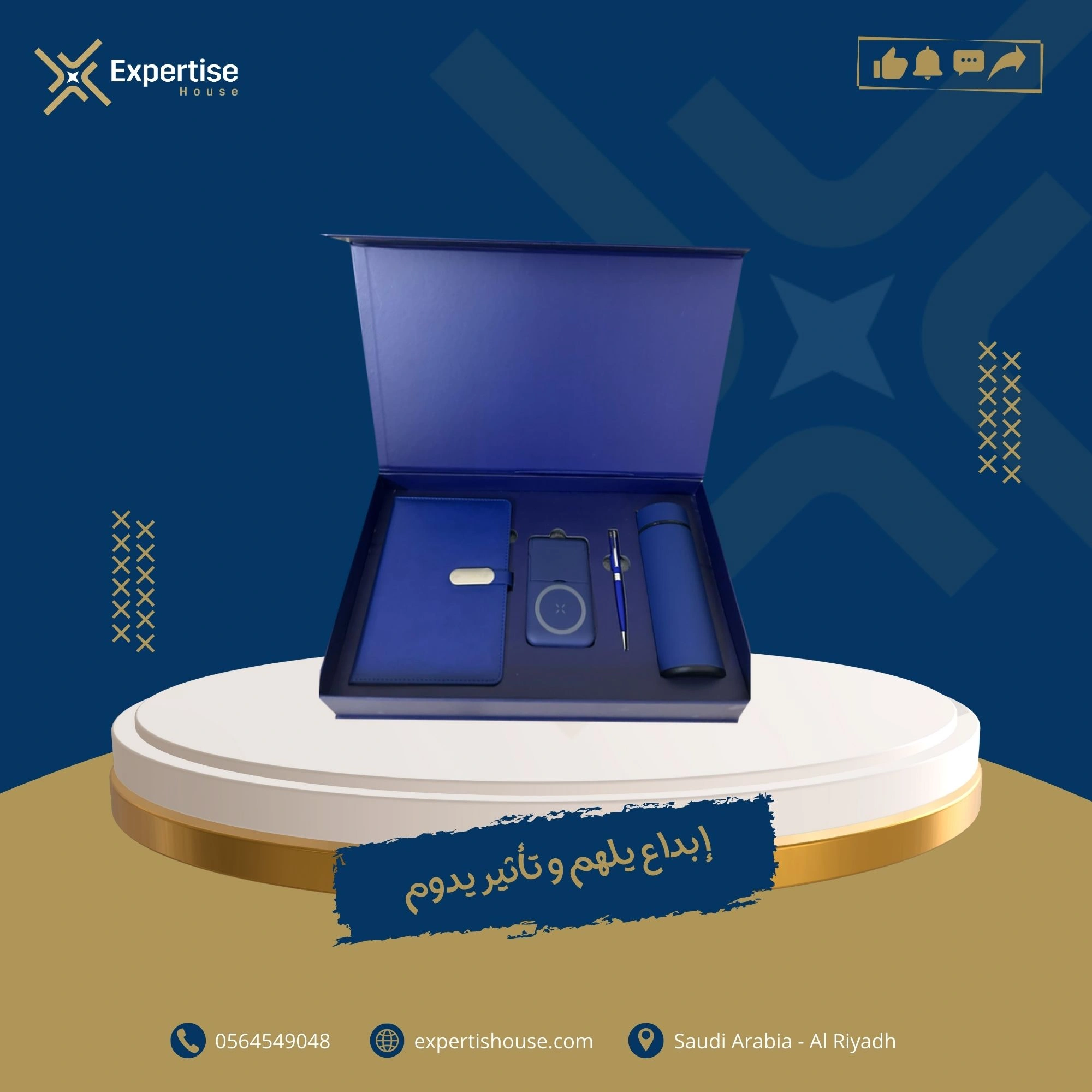 طقم هدايا مكتبي أنيق بلون أزرق يشمل مفكرة جلدية، شاحن لاسلكي/محفظة بطاقات صغيرة، قلم وزجاجة حرارية داخل علبة فاخرة.