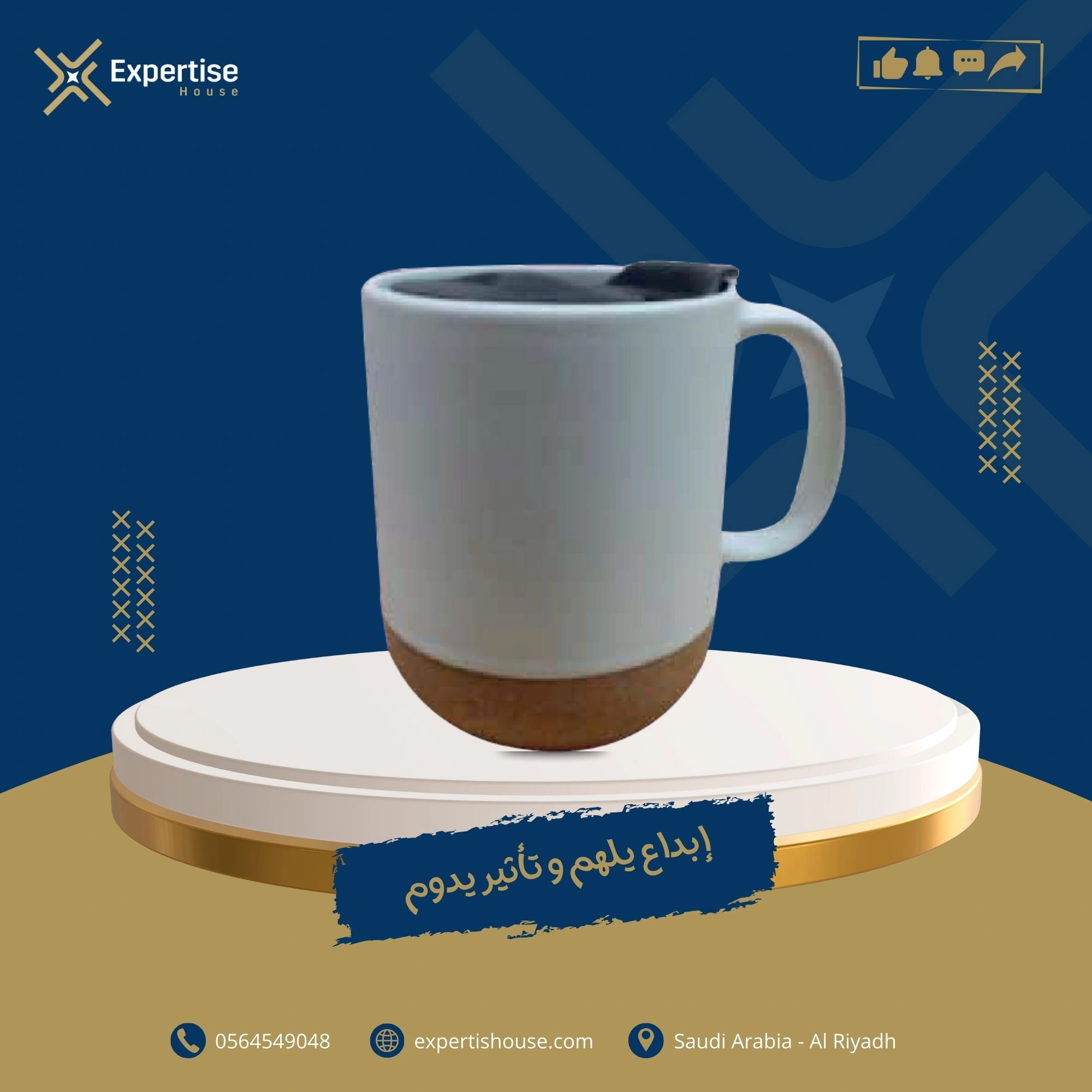 كوب سيراميك أنيق بقاعدة فلين وغطاء محكم للحفاظ على الحرارة ومنع الانسكاب، سعته تقريبية ~350 مل.